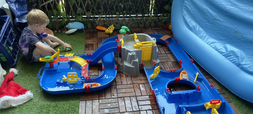 We bought our first AquaPlay set as a Christmas present. In true Aussie style, it was over 30°C, and we thought we’d be clever and set it up on Christmas Eve. Spoiler: it took longer than expected. Each red clamp has two foam seals that need to be applied by hand—worth it, but not ideal at midnight with a sleep-resistant child!