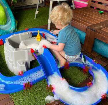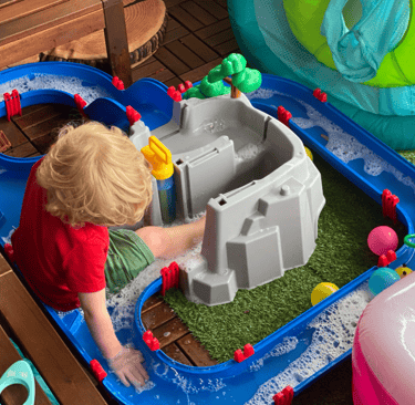 This might seem like a no-brainer, but being from the UK and the way I was brought up, paddling pools and water toys used cold water only, so the concept of using warm water to keep my kids engaged, even on colder days didn't occur to me. Thankfully, daddy came to the rescue and used warm water to fill up the canal. My little man was over the moon and keen to play for longer and even on colder days. Well done dad!
