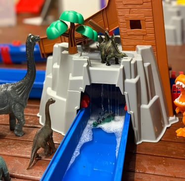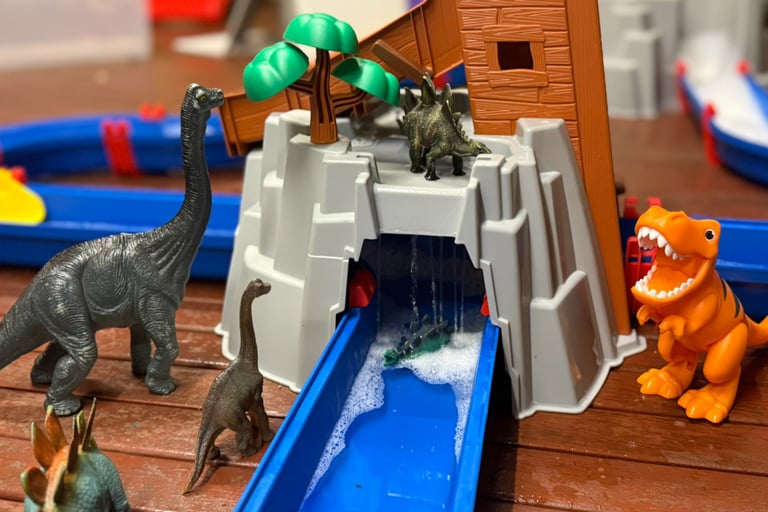My daughter loves dinosaurs! Together we set up the canal to have dinosaur "islands" where different dinosaur species can roam. She enjoys floating the baby dinosaurs around to find their "mummy and daddy" dinosaurs.