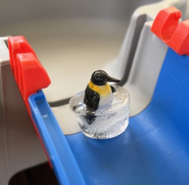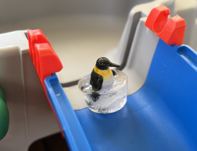Image: Penguin stuck in frozen ice (made by popping penguins in a cupcake tray with water and putting in the freezer over night).